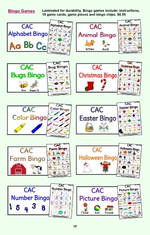 Bingo Games Laminated for durability. Bingo games include: instructions, 10 game cards, game pieces and bingo chips. $8.95 18